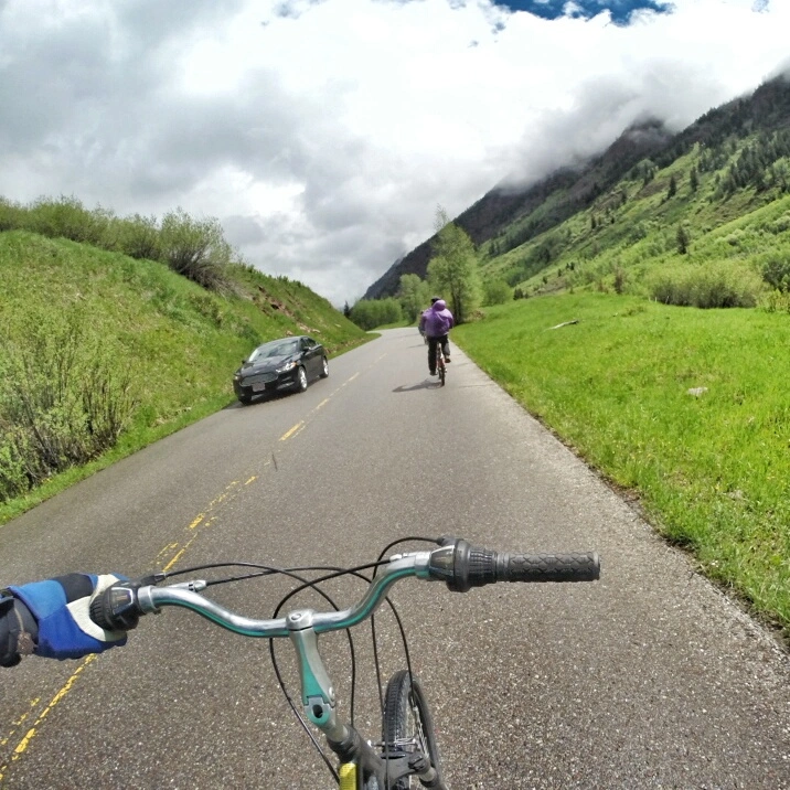 Imagem Anterior Próxima imagem Bike Tour Maroon Bells – Aspen Maior parte do percurso era uma descida leve Aspen, Snowmass, Maroon Bells, White River National Forest, Colorado, EUA